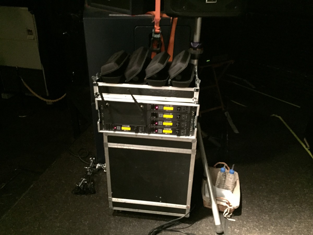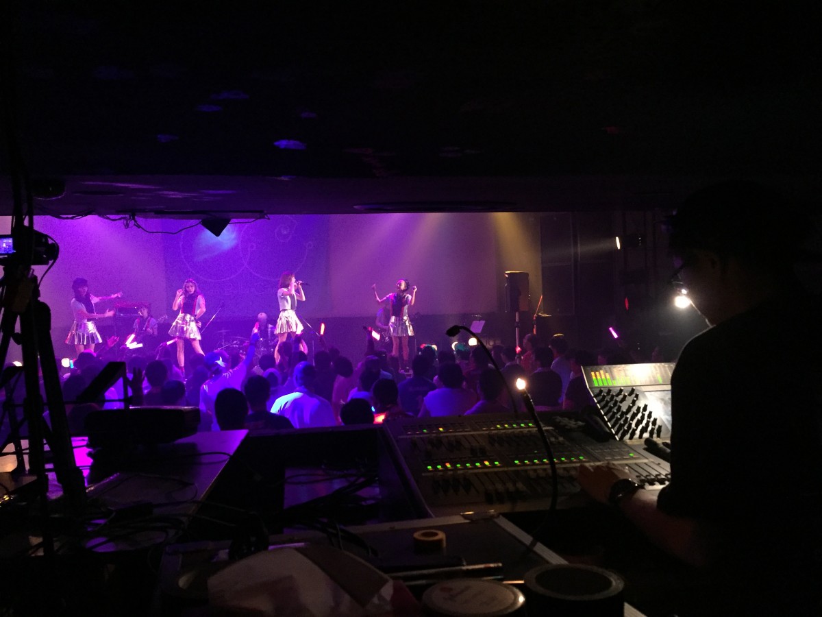 今回の出演者さんの構成はドラム、ギター、ベースのバックバンド3名に、Macにて3トラック、クリックの再生、ヴォーカル4名という構成で、アウトプットは通常の回線に各出演者へインイヤーモニターという構成でした。